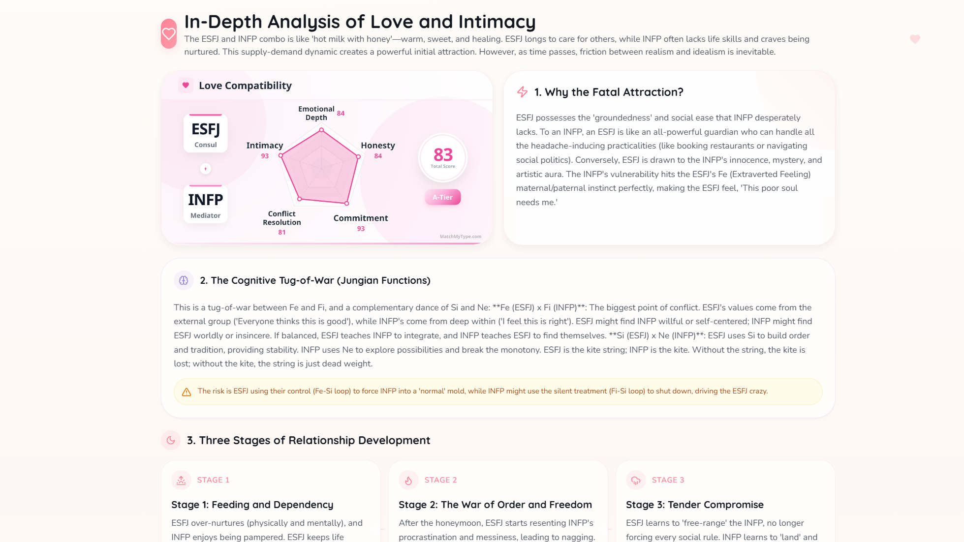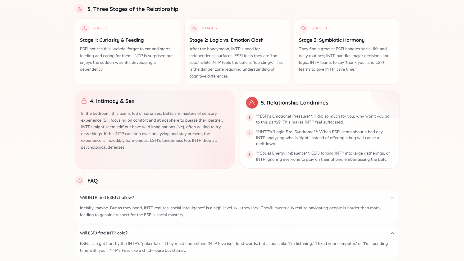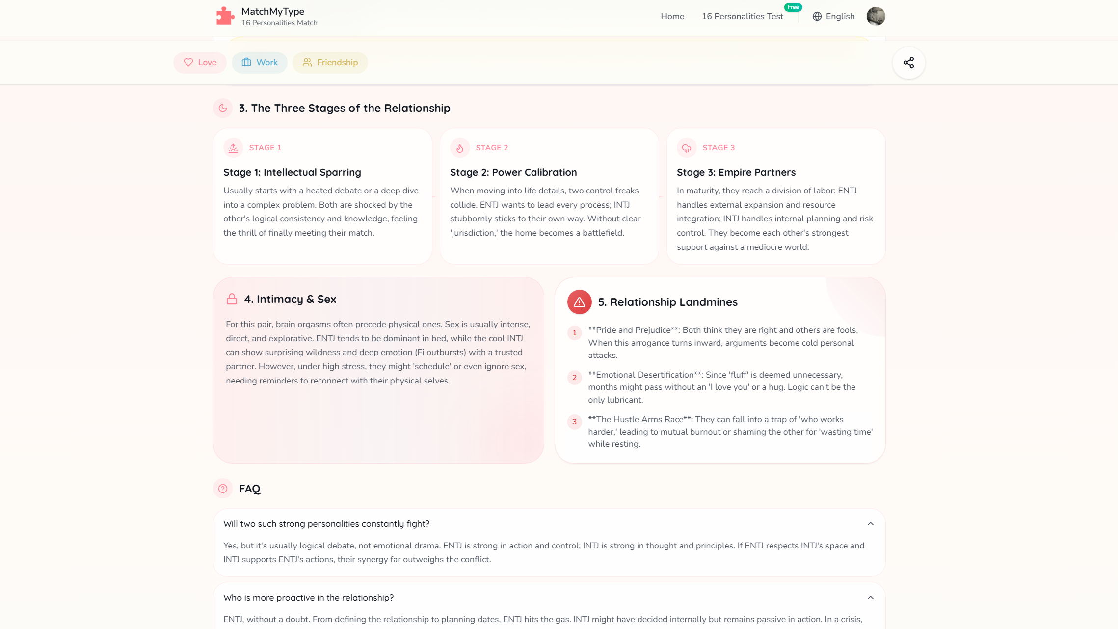I decided to test generate a compatibillity result between an INTP and an ESFJ. The system scored their compatibillty score as 90 out of 100, which is pretty high. The system explained their law of attraction, The Cognitive Gearbox, Three Stages of the Relationship, Intimacy & Sex as well as Relationship Landmines, which are shown in the pictures below.