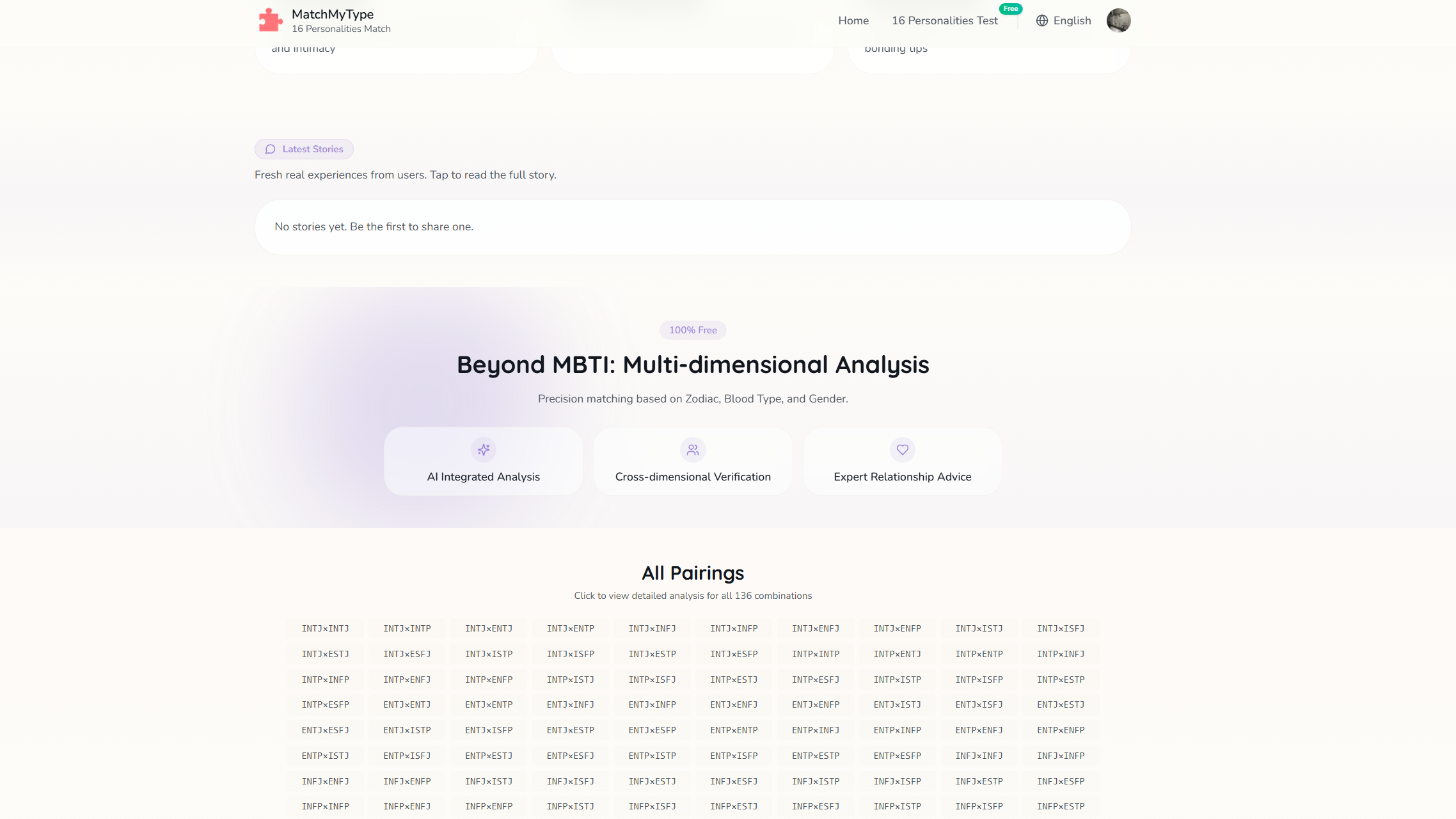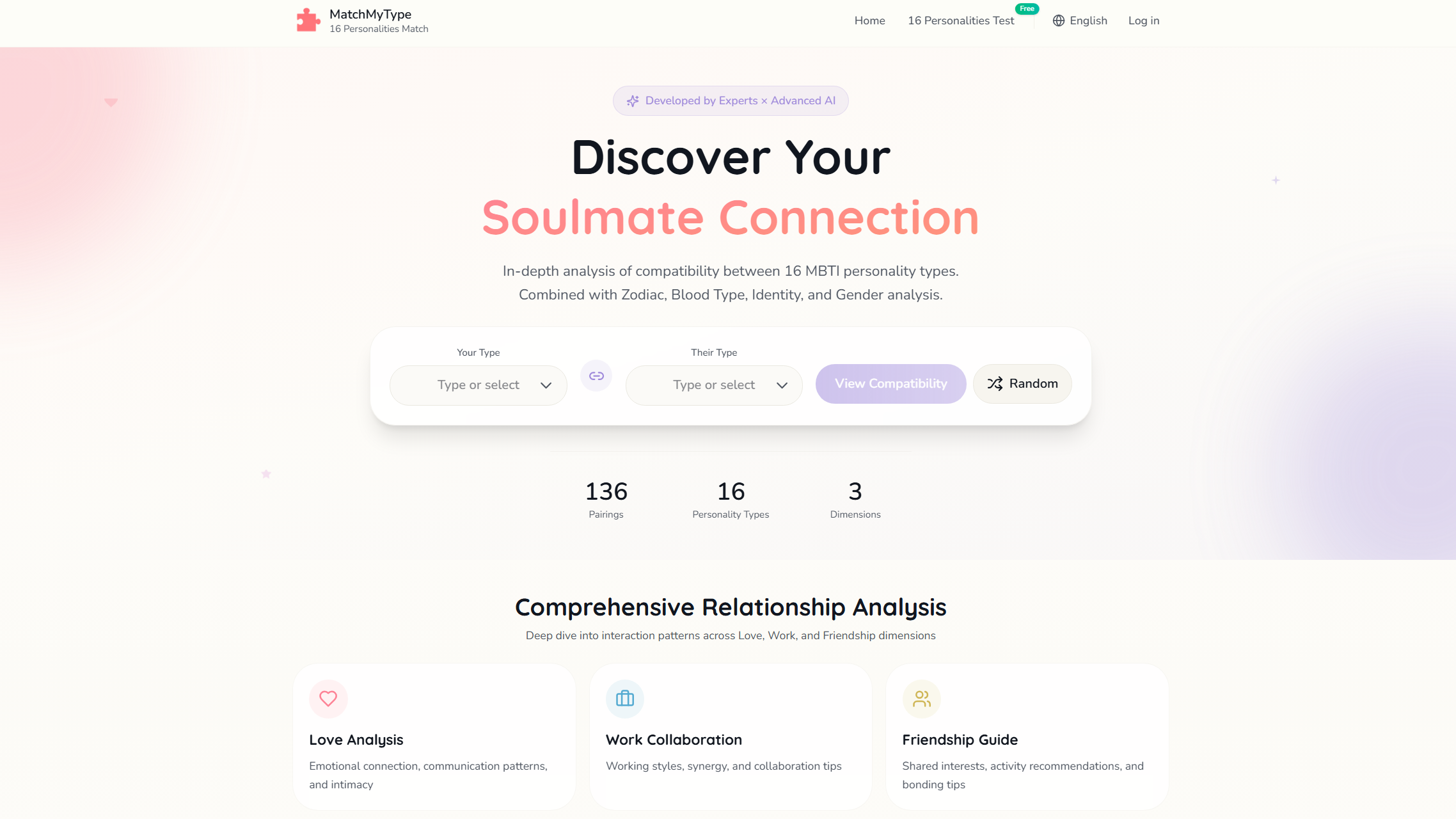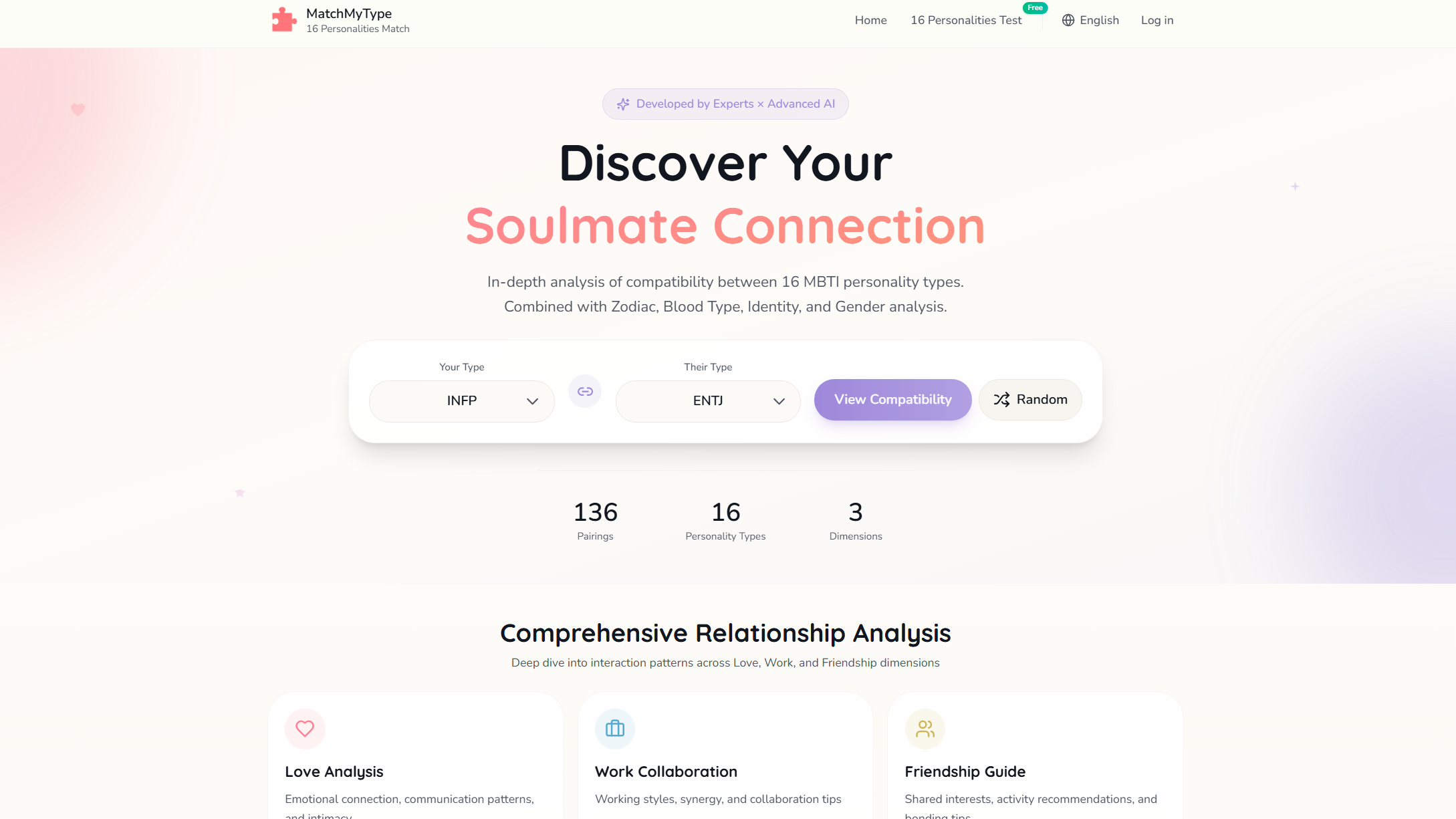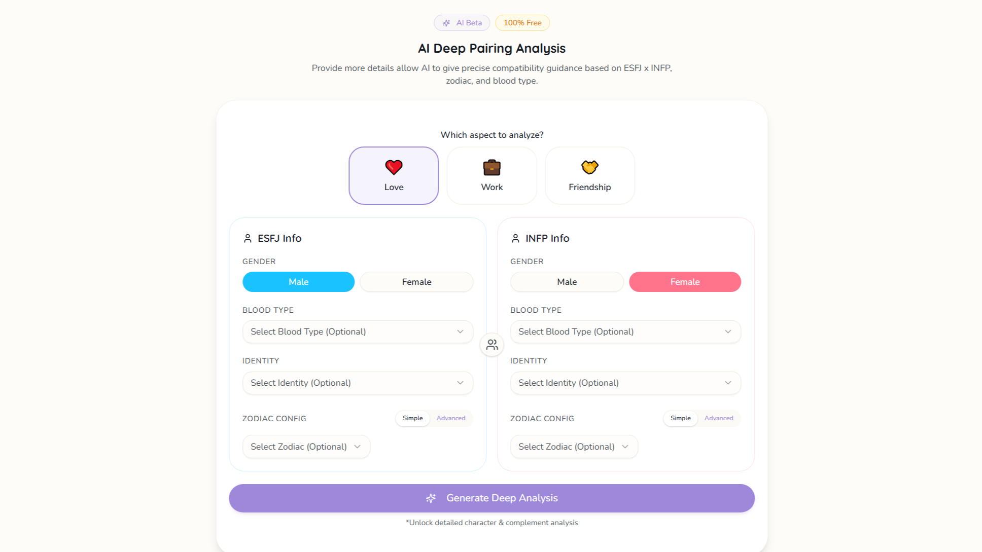 The home page gives users the option to select their personality type along with another type they are interested in learning about, and generates an analysis once they click on the “View Compatibility” option. The site then provides an in depth description of the pros and cons, as well as patterns in romantic relationships, workplace collaborations, and friendships. If users prefer a more in-depth analysis between themselves and their person of interest, there is also an option to generate a deep AI generated analysis that includes information such as blood type, gender, and zodiac sign.